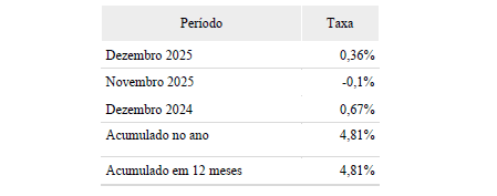 O IBGE calcula também o Índice Nacional de Preços ao consumidor. Em Aracaju, o INPC registrou alta de 0,27% em dezembro de 2025. No ano de 2025, o índice na capital sergipana acumula alta 4,55%.