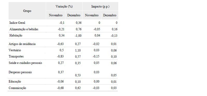 Em dezembro, o grupo que apresentou maior alta foi o de vestuário (1,1%), representando um impacto de 0,06%. No mesmo período de 2024, esse grupo apresentou uma alta de 0,61%.