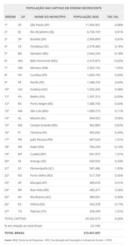 No agregado do país, a população chegou a 213,4 milhões em 1º de julho de 2025, avanço de 0,39% frente a 2024. As 27 capitais reúnem 49,3 milhões de habitantes (23,1% do total). O levantamento já considera a criação do município de Boa Esperança do Norte (MT), com 5.877 habitantes, elevando para 5.571 o número de municípios brasileiros.