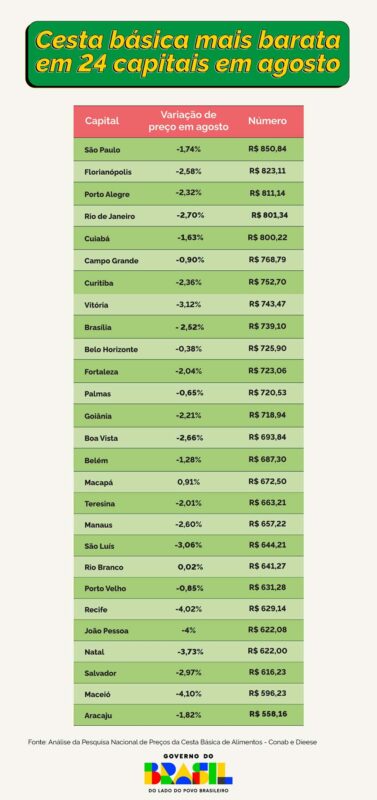 No mesmo levantamento, São Paulo apresentou a cesta mais cara do país (R$ 850,84). Já os menores valores concentram-se no Norte e no Nordeste, com Aracaju na liderança de menor custo nacional.