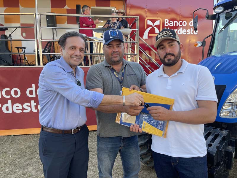 O produtor Alisson Arlindo, de Nossa Senhora da Glória, financiou a compra de um trator para dinamizar a produção de milho. Na foto, o superintendente estadual do BNB, César Santana, faz a entrega da chave ao lado do fornecedor (Foto: Davi Santos)
