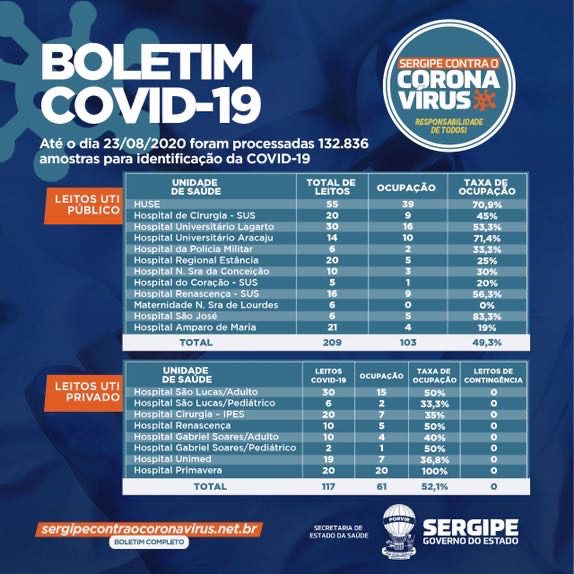 A taxa de ocupação de UTIs pública e privada continua em queda em Sergipe. Ela atingiu 49,3% e 52,1%, respectivamente, ontem. Os dados estão no Boletim Epidemiológico divulgada na noite deste domingo pela Secretaria de Estado da Saude (SES).