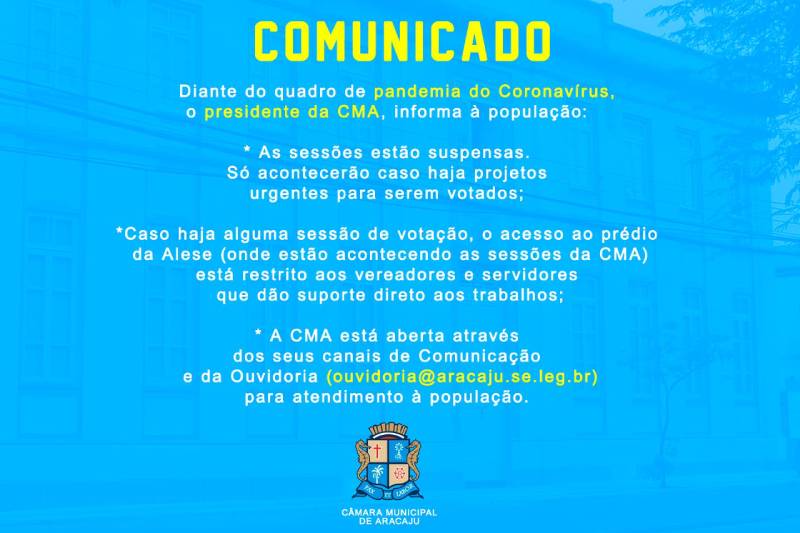 As sessões da Câmara Municipal de Aracaju estão suspensas. Somente acontecerão se houver necessidade de votação de alguns projeto urgente e de grande relevância para a população. Nesses casos, os vereadores serão avisados previamente pelo presidente e a assessoria da Mesa;