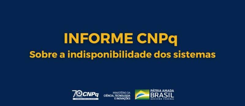 O CNPq, ligado ao Ministério da Ciência, Tecnologia e Inovações (MCTI), comunicou no sábado (24) que os sistemas ligados à entidade estavam fora do ar. Entre elas, as Plataformas Lattes, que abrigam o Currículo Lattes, o Diretório de Grupos de Pesquisa, o Diretório de Instituições e Extrator Lattes e a Plataforma Integrada Carlos Chagas Carlos.