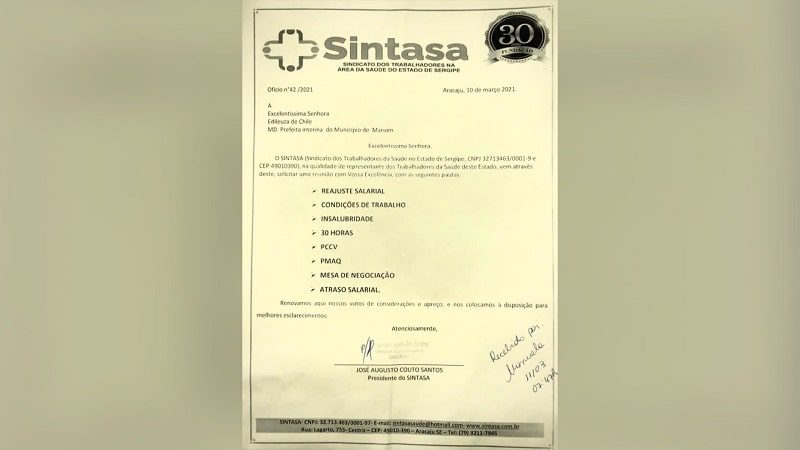 Diante disto, o Sintasa enviou nesta quinta-feira, 11, um documento para a prefeita interina Edileuza de Chile solicitando uma reunião com a entidade a fim de poder solucionar ou traçar alguns rumos para dirimir estes problemas.
