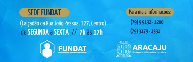 Para participar dos processos seletivos referentes às vagas disponíveis, é necessário ter experiência na área. Além disso, os interessados devem comparecer à sede da Fundat, no calçadão da rua João Pessoa, 127, Centro, portando RG, CPF e currículo. A Fundação funciona de segunda a sexta-feira, das 7h às 17h. Para outras informações, os interessados podem contar o órgão pelos telefones (79) 3179-1331 / (79) 9 9132-1200.