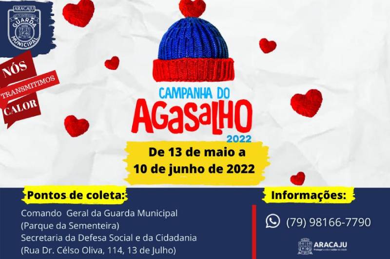 Buscando amenizar o sofrimento dessas pessoas, a Prefeitura de Aracaju, através da Guarda Municipal de Aracaju (GMA), órgão vinculado à Secretaria Municipal da Defesa Social e da Cidadania (Semdec), realizará, entre os dias 13 de maio e 10 de junho, a terceira edição da Campanha do Agasalho. A iniciativa pretende arrecadar agasalhos, roupas e calçados em bom estado de conservação.