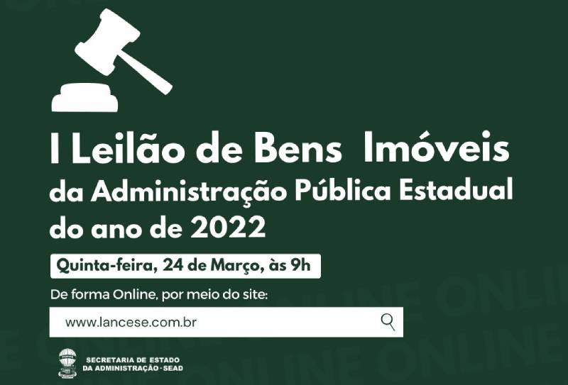 Acontece nesta quinta-feira, 24 de março, às 9h, o I Leilão de Bens Imóveis de 2022. O leilão, do tipo maior oferta, será realizado, de forma online, por meio do site www.lancese.com.br. Estão sendo disponibilizados oito imóveis, através de lotes, onde cinco são de propriedade do Estado de Sergipe e três de propriedade do Instituto de Promoção e de Assistência à Saúde de Servidores do Estado de Sergipe (Ipesaúde).
