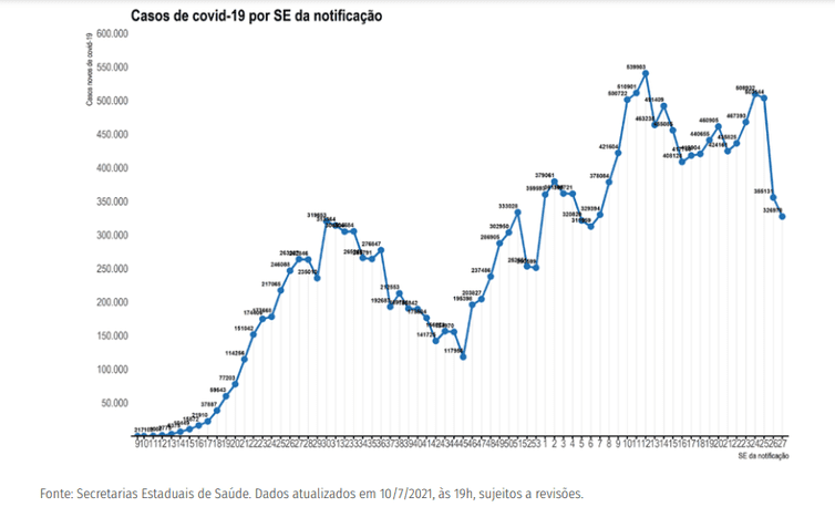 Na Semana Epidemiológica 27 (SE 27), autoridades de saúde registraram 9.306 pessoas que não resistiram à covid-19, enquanto o boletim epidemiológico do Ministério da Saúde na semana anterior trouxe 10.852 óbitos.