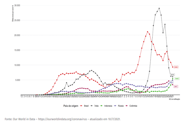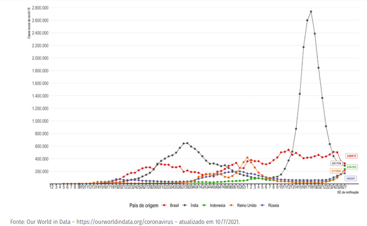 O Brasil também foi a nação com mais novos casos nesta semana, seguido por Índia (291.789), Indonésia (234.155), Reino Unido (211.508) e Rússia (169.291). Na comparação em números absolutos, desde o início da pandemia, o Brasil fica na 3ª posição, atrás dos EUA (33,8 milhões) e Índia (30,8 milhões). Na comparação proporcional, por 1 milhão de habitantes, o Brasil ocupa a 14ª posição.