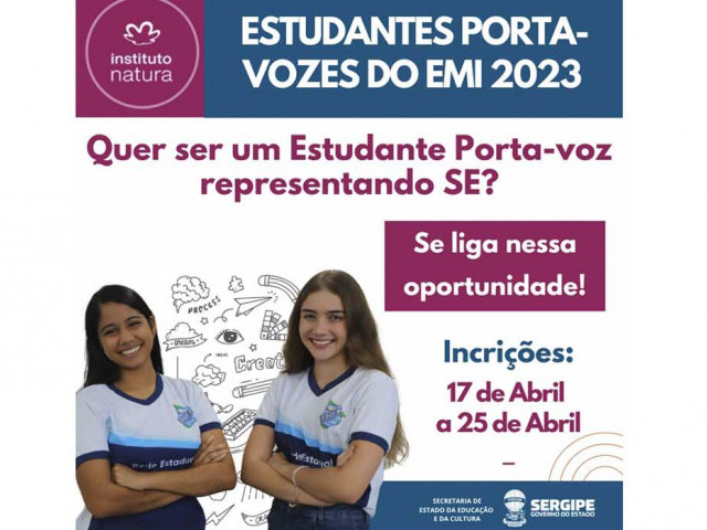 A Secretaria de Estado da Educação e da Cultura (Seduc) torna público que, a partir desta segunda-feira, 17, estão abertas as inscrições para a Seleção de Estudantes Porta-Vozes do Ensino Médio Integral, iniciativa em parceria com o Instituto Natura, cujo objetivo é promover ações de interações entre os estudantes das escolas em tempo integral.