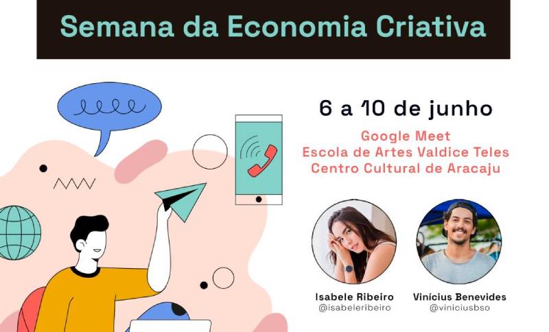 A Semana da Economia Criativa faz parte da contrapartida do Edital de Subsídios para Espaços Culturais, da lei de fomento à cultura – Lei Aldir Blanc. Os workshops e oficinas ocorrem na Escola de Artes Valdice Teles, no Centro Cultural de Aracaju e pela plataforma online Google Meet.