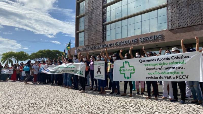Com o apoio do Sindicato dos Trabalhadores na Área da Saúde do Estado de Sergipe (Sintasa), os servidores estatutários e celetistas da Fundação Hospitalar de Saúde (FHS), Fundação Estadual de Saúde (Funesa) e Fundação de Saúde Parreiras Horta (FSPH), além dos funcionários da Secretaria de Estado da Saúde (SES), representados pelo Sintasa, começaram uma paralisação de 24h na manhã desta terça-feira, 22, e realizaram um ato público, na frente da Assembleia Legislativa de Sergipe (Alese), para reivindicar o reajuste linear de 34,44% para todos os servidores, entre outras bandeiras de luta.