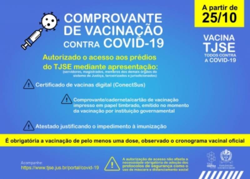 Em reunião realizada na manhã desta sexta-feira, 08/10, o Gabinete de Crise do Tribunal de Justiça de Sergipe (TJSE), por unanimidade, deliberou pela exigência da comprovação da vacinação contra a Covid-19, a partir de 25/10, para o ingresso de servidores, magistrados, terceirizados, estagiários, prestadores de serviço, integrantes dos demais órgãos do sistema de Justiça e jurisdicionados nos fóruns e demais prédios e espaços do Poder Judiciário sergipano.