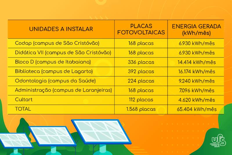 Dos atuais 35.292 kWh gerados por mês, com a ampliação a UFS terá uma capacidade total de produzir 100.696 kWh/mês. Os R$ 2,4 milhões de investimento são suficientes para a instalação de 1.568 novas placas fotovoltaicas, que ampliarão os sistemas dos campi de São Cristóvão (Codap e Did. VII), Lagarto (biblioteca) e da Saúde (Departamento de Odontologia), além de levar energia solar para os campi de Itabaiana (Bloco D) e Laranjeiras, e para o prédio do Cultart.