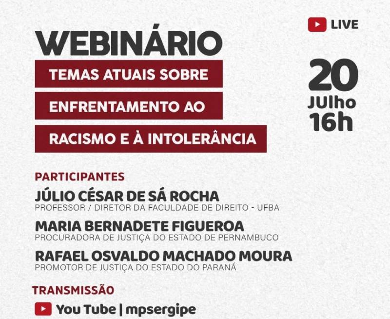 O Ministério Público de Sergipe, por meio da Escola Superior (ESMP) e da Coordenadoria de Promoção da Igualdade Étnico-Racial (Copier), realizará, no dia 20 de julho, às 16h, o Webinário “Temas Atuais sobre Enfrentamento ao Racismo e à Intolerância”, para membros e servidores do MP, e demais interessados. A transmissão será feita pelo canal do MPSE no Youtube.