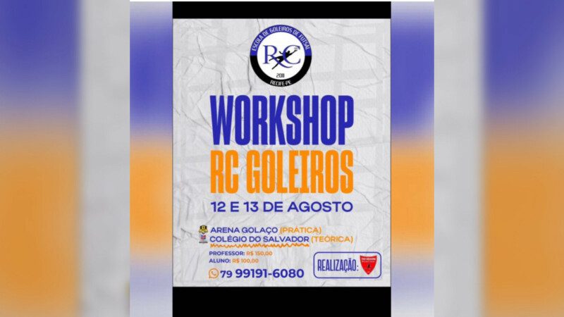 Nos dias 12 e 13 de agosto, a Escola RC de Goleiros irá promover um Workshop dedicado aos goleiros na cidade de Aracaju. O evento será realizado em dois locais distintos, com a parte teórica ocorrendo no Colégio do Salvador e a parte prática na Arena Golaço, localizada na região da Atalaia.